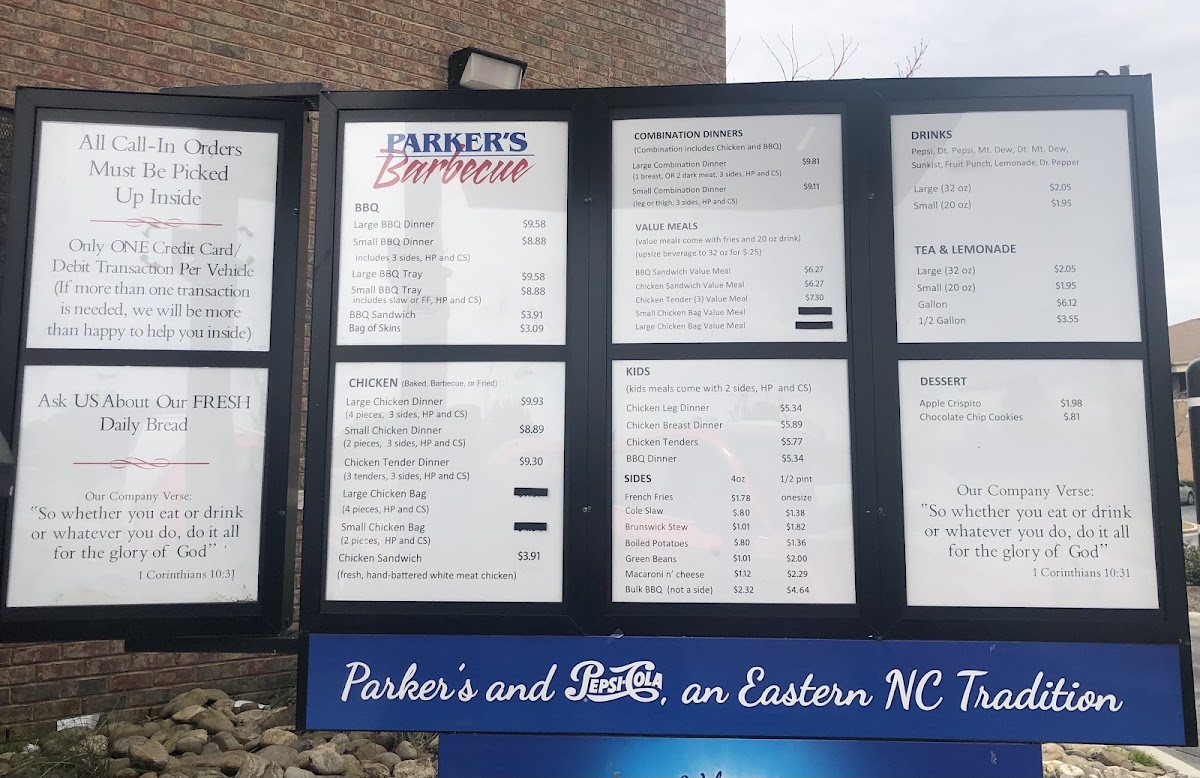 Parker's Barbecue, located at 1801 E Arlington Blvd in Greenville, NC, is a beloved southern gem known for its authentic barbecue and warm hospitality. With a diverse menu featuring flavorful barbecue dinners, crispy boneless wings, and signature sides like hush puppies and Brunswick stew, each dish showcases a commitment to quality and tradition. Diners rave about the consistent flavors and freshness, making it a go-to spot for both locals and visitors. The absence of tipping reflects a focus on genuine service, enhancing the overall dining experience. Parker’s truly embodies the spirit of Carolina barbecue, leaving patrons craving more with every bite.